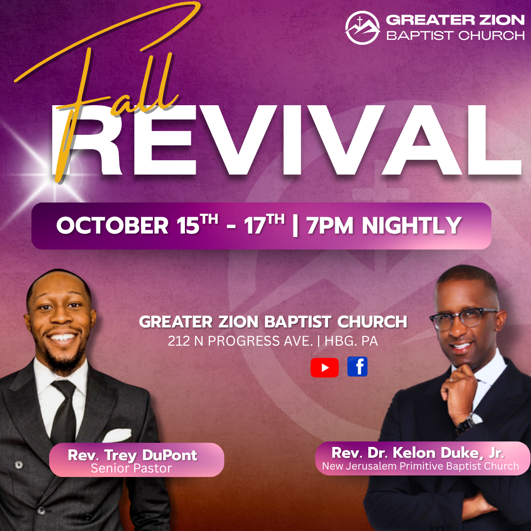 Welcome to Greater Zion Baptist Church, where we are "Being the Church on Purpose." We're a vibrant and loving community dedicated to exalting the Savior, explaining the Scriptures, equipping the saints, engaging the lost, and encouraging our community. Whether you’re new to the faith, a seasoned believer, or just exploring, you’ll find a warm welcome and a place to belong. Our doors and hearts are open wide as we journey together in faith. Come as you are and discover the love and grace of Jesus Christ with us. We can’t wait to meet you!